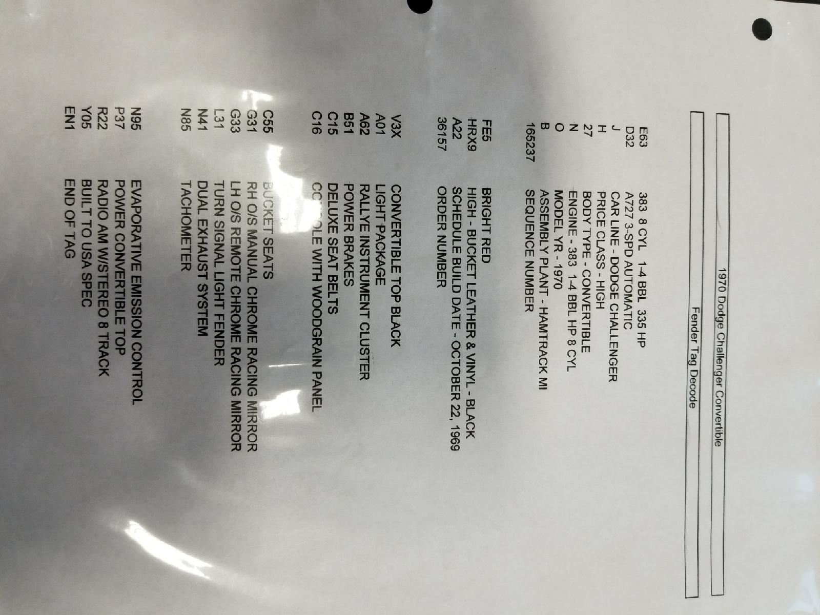 1970 DODGE CHALLENGER 383 CONVERTIBLE BUILD SHEET The Electric Garage