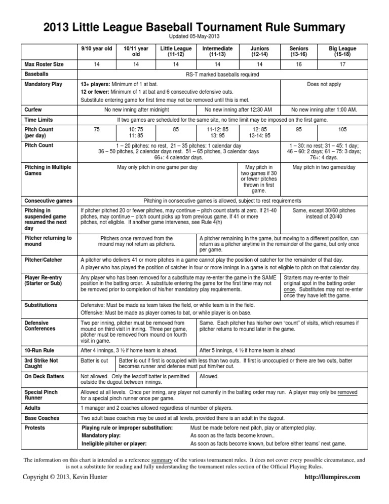 2013 Little League Tournament Rules Summary Chart Baseball BB Pitcher