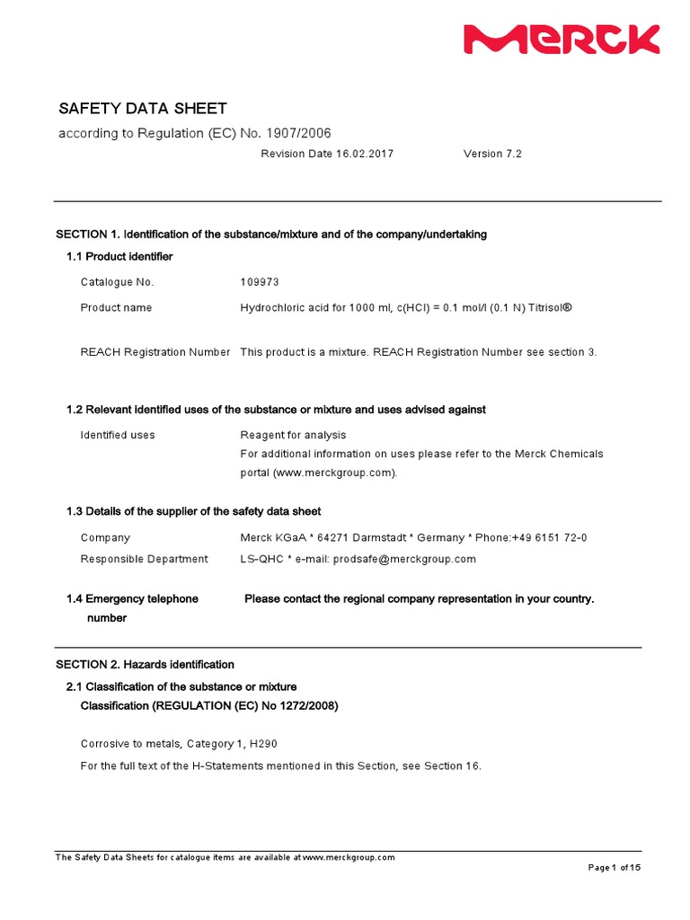 Web material safety data sheet or sds for hydrochloric acid 109970 from merck for download or viewing in the browser.