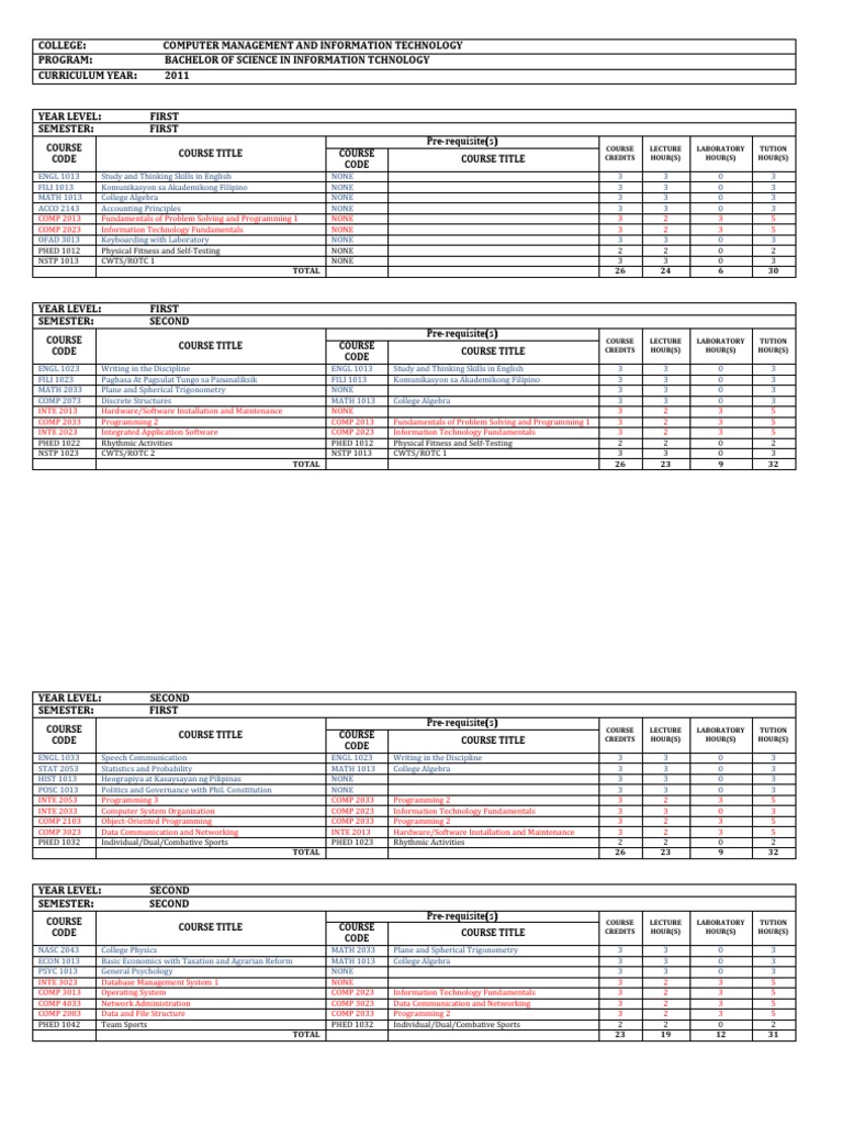 PUP BSIT Curriculum sheet 2011 Computer Programming Course Credit